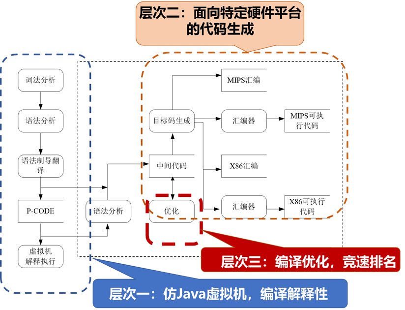 挑战多元化:课程设计了PCODE和MIPS汇编两种不同难度的目标代码、不同的中间代码要求和代码优化要求,在构建一个完整编译系统目标不变的前提下,让学生可以根据自己的理论知识掌握状况和动手能力情况自行选择相应的挑战,进而让学生们既能感受到构造一个完整编译器的获得感,又不至于因为难度太大而放弃或者抄袭。