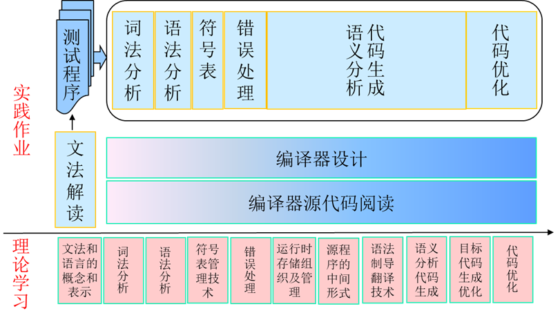 循序渐进:根据课程目标,进阶式地组织课程内容,将构建一个编译系统的过程庖丁解牛般地划分为几个核心步骤,在每一步里都注重对学生的过程培养、过程考核,从而渐进式地培养学生相关方面的能力,及时地发现学生在学习中存在的问题。